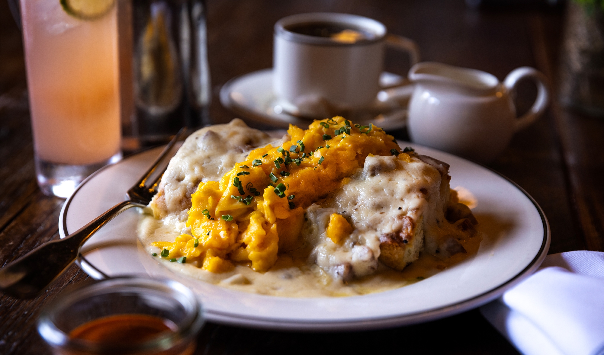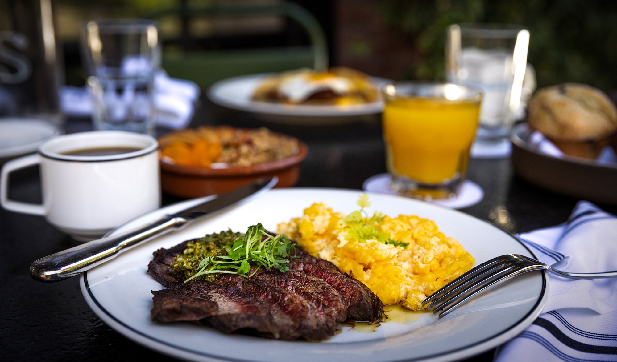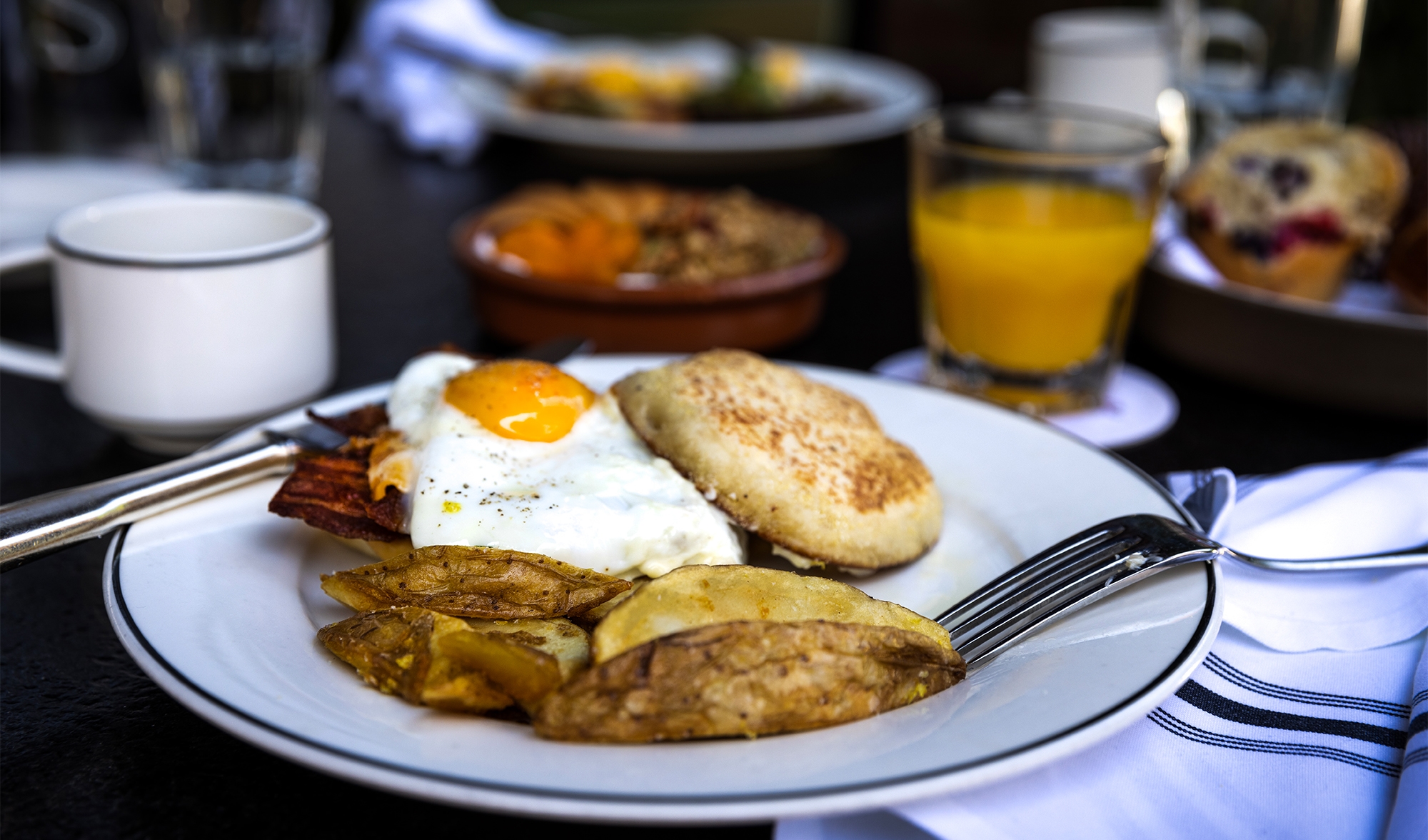 +Otto’s Breakfast of Two Eggs, Bacon and Sausage with Whole Wheat Toast, Jam and Butter